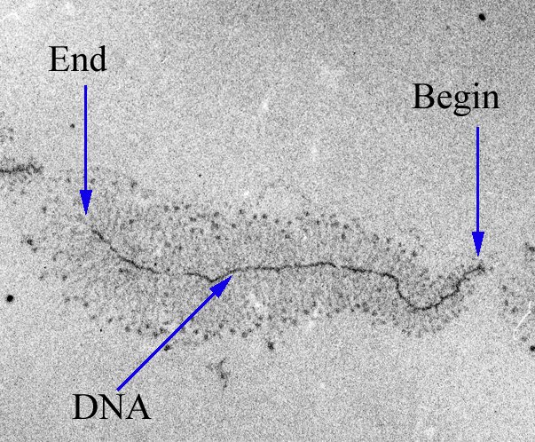 Source: Picture taken from [Miller et al., 1970] , O. L., Hamkalo, B. A., & Thomas, C. A. (1970). Visualization of Bacterial Genes in Action. Science, 169(3943), 392–395. doi:10.1126/science.169.3943.392#